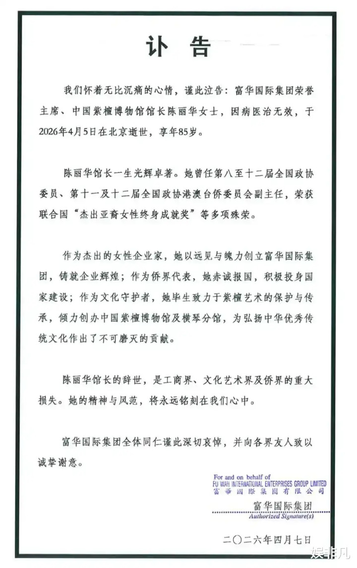 集团荣誉主席、中国紫檀博物馆馆长陈丽华女士,因病医治无效,于 2026 年 4 月 5 日在北京澌灭,享年 85 岁。