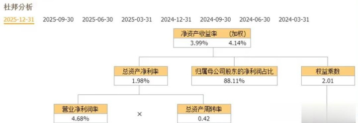 再看ROE(净财富收益率)数据,2025年前三季度加权平均ROE是3.41%,在这四家里名顺序三。财务杠杆倍数最低,欠债率在四家里最低,财务状态相对矜重。