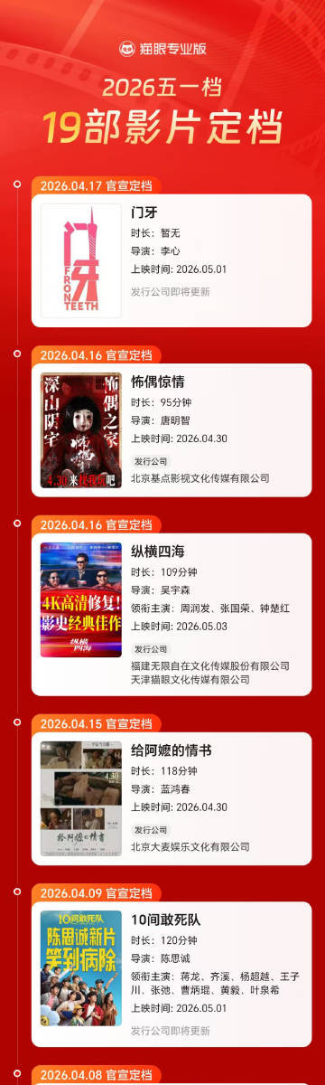 落幕刻下已有19部影片定档2026五一档上映。