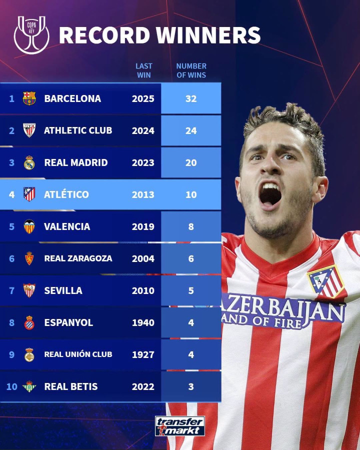 幸运5app 西班牙国王杯夺冠榜: 巴萨32次居首;皇马和马竞名次三四