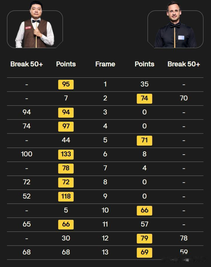 比赛运行的第一局,穆迪上手,径直单杆84分顺利。第二局,两个东谈主都有契机,最终穆迪72-42分顺利。第三局,穆迪上手,单杆91分顺利。