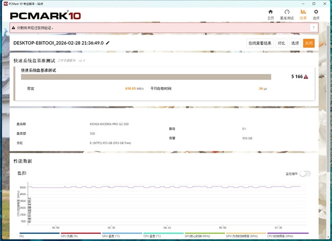 由于我也无间会将这台电脑算作居家办公和舒服文娱用机,因此往常使用时的体验和性能领略亦然重心之一。在这方面,我袭取PCMark10算作测试器具。PCMark10专科版自带存储测试,可以灵验反馈出一块硬盘的往常使用领略。在快速系统盘基准测试中,铠侠VE10拿到5166分,带宽和平均存取时候分歧为610MB/s和24μs。