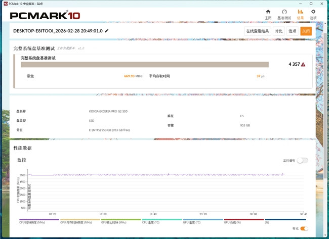 使用圆善系统盘基准测试进行复测,铠侠VE10拿到4357分,带宽和平均存取时候分歧为669MB/s和37μs。