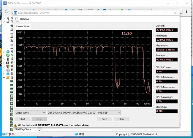 在十分“暴力”的AIDA64全盘写入测试中,许多硬盘在出缓之后的速率都会暴跌到几百MB/s的水平,可是铠侠VE10实在全程都跑在接近满速的景象,只须末段出现了两次狭小的掉速,时候很短,而且最低值也过千了。换句话说,就算往内部拷贝1TB的大文献,全程也只须11分钟,平均速率高达9377MB/s。这领略,谁看了都得说一声“硬”!