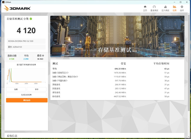 然后是比较能体现一部分游戏性能的3DMark存储基准测试,铠侠VE10的全体领略一经让东说念主十分满足,4100+的分数遥遥开始于绝大广博产物。如若你是Steam重度用户,那么铠侠VE10的性能领略十分可靠。