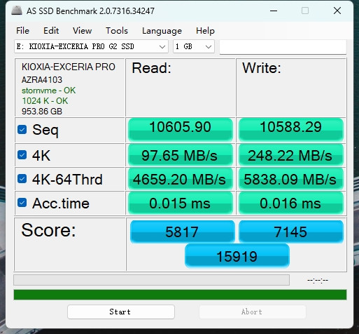 随后是AS SSD跑分,15919分这个得益十分能打,法例读写均打破10000MB/s,4K-64Thrd速率也很可以,全体性能领略十分可以。