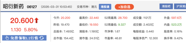 上证报中国证券网讯(记者杨子晏)3月31日,港股生物医药板块走强。其中,昭衍新药H股开盘报20.2港元/股,开盘快速拉升后回落。贬抑10时53分,王者荣耀投注app昭衍新药H股报20.6港元/股,涨5.8%。