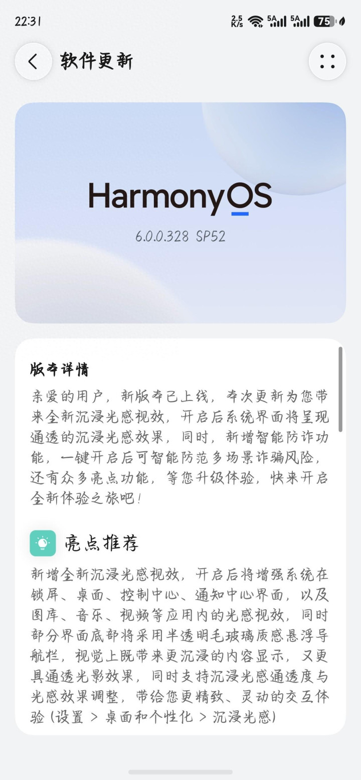 需要绝顶证实的是,2026年4月7日华为还推送了针对SP52版块的环节补丁包,该补丁竖立了锁屏播控中心插件在开启千里浸光感视效强档位时可能出现的介怀框线路问题,体现了华为对系统细节的执续打磨与快速反应。