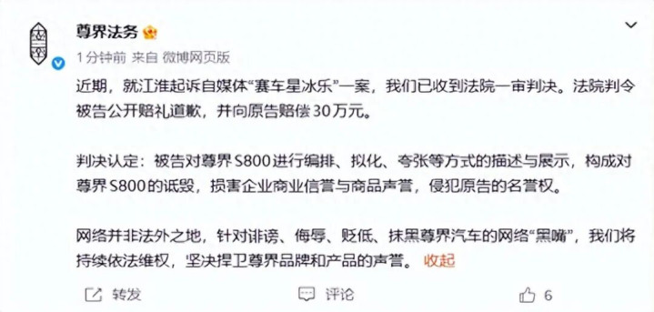 客岁5月,尊界法务晓谕告状“赛车星冰乐”,指控其屡次发布针对尊界S800的失实内容,充斥侮辱和坏心乱骂的表述,还刻意指导公论走向。