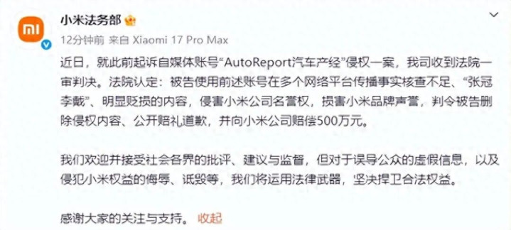 2月24日,小米公法则务部门对外披露,一审判决还是下达,恒久发布针对小米空幻内容的自媒体“AutoReport汽车产经”,被法院判处补偿500万元,同期需删除侵权内容并公开说念歉。